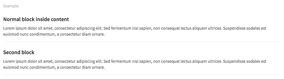 Content blocks (.content-block) are the basic grouping of content. They are commonly used in lists, and are separated by a botton border.
