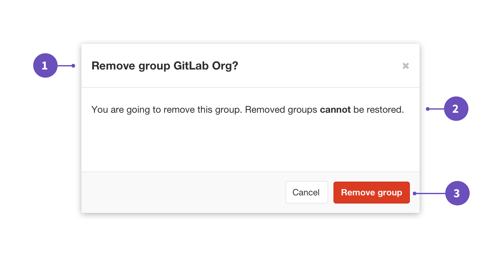 - When the action is irreversible, modals provide the details and confirm with the user before they take an advanced action.